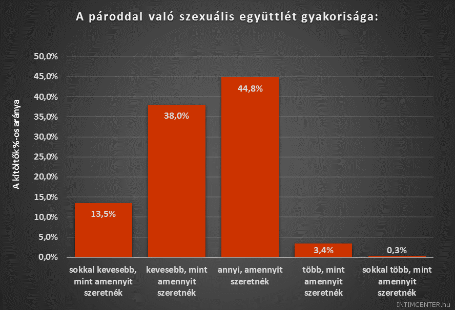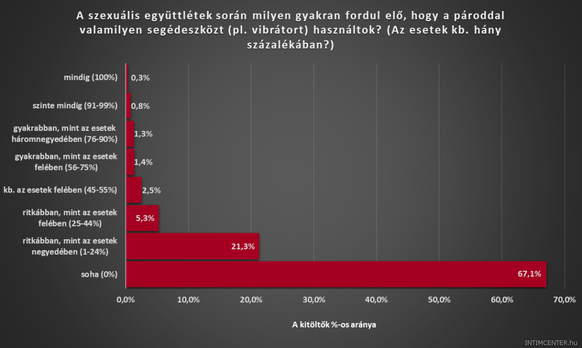 A szex segédeszköz nélkül is kielégítő. Kétharmad soha semmilyen szexuális segédeszközt nem használ az együttlétek során, és csupán kis számban nyilatkoztak arról, hogy mindig, szinte mindig, vagy az esetek háromnegyedében valamilyen eszköz is előkerül az örömszerzéshez. A válaszadók 32 százaléka nagyon, 36 százaléka pedig viszonylag elégedett a párjával megélt szexuális életével. Több mint 40 százalékuk rendszeresen, 36 százalékuk pedig szinte mindig átél orgazmust az együttlét során párjával.